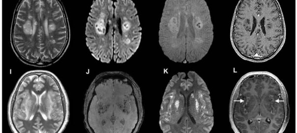 Imagens cerebrais de pacientes com coronavírus, de um estudo publicado em julho. Alguns desenvolvem complicações neurológicas graves, incluindo danos nos nervos. Foto: Ross W. Paterson, Rachel L. Brown, et al. / Imprensa da Universidade de Oxford / via NYT